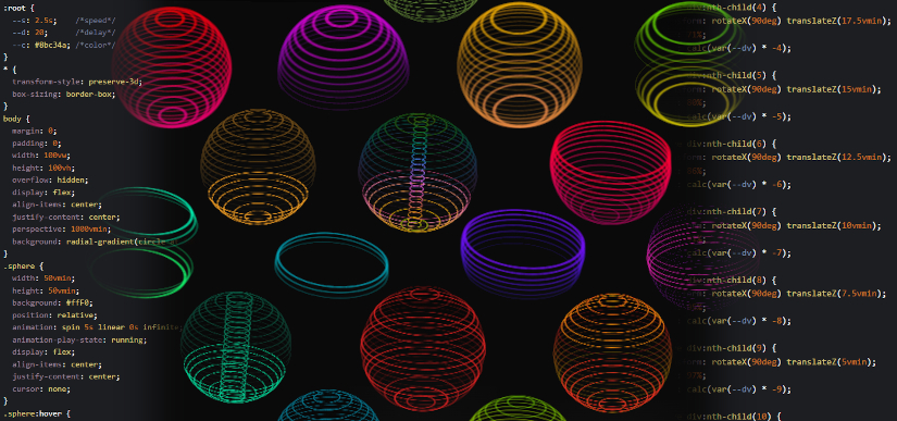 Esta colección creada en Codepen contiene más de 20 esferas en 3D creadas en CSS con diferentes animaciones y colores. Se muestran a continuación, una por una, con una pequeña descripción de su funcionamiento.